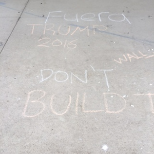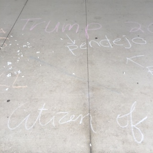Action outside the University of Michigan Museum of Art in reaction to chalk messages written in favor of one candidate and his racist proposals against immigration. I distributed chalk and invited folks to respond. 28 March 2016